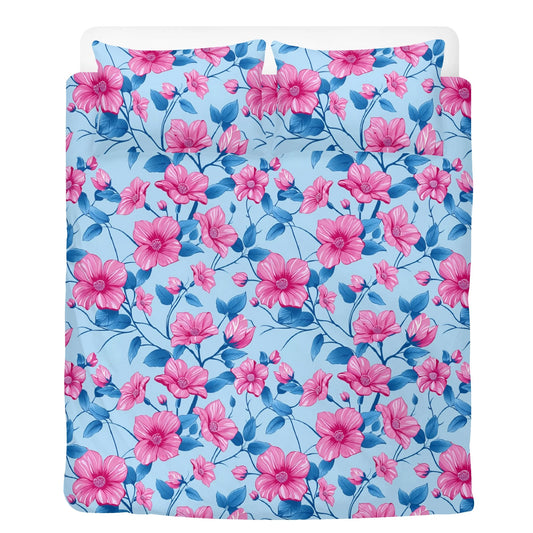 Pink Blue Floral Bedding Set (3pcs), Flowers One Duvet Cover and Two Pillow Covers California King Queen Full Twin Size Bed Bedroom Decor