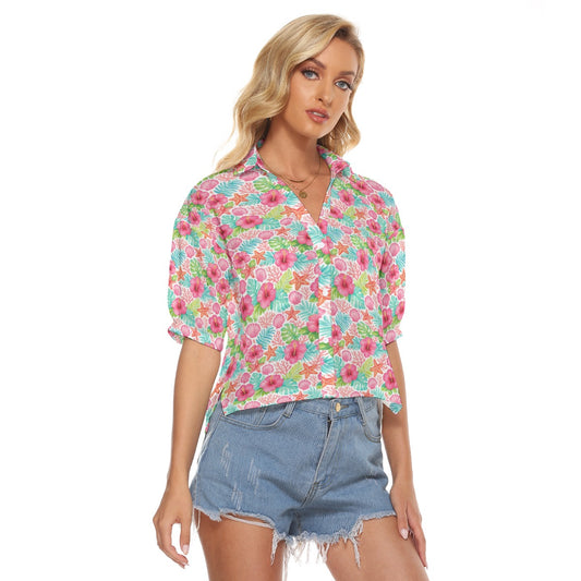 Pink Floral Women Button Up V-Neck Shirt, Beach Hibiscus Coral Short Sleeve Print Chest Pockets Summer Ladies Collared Designer Blouse