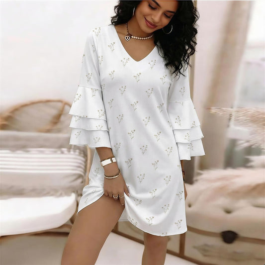White Floral Women's Mini Dress, Stacked Ruffles Long Sleeve Ladies Casual Cute Designer Elegant Plus Size Cocktail Boho Garden Party