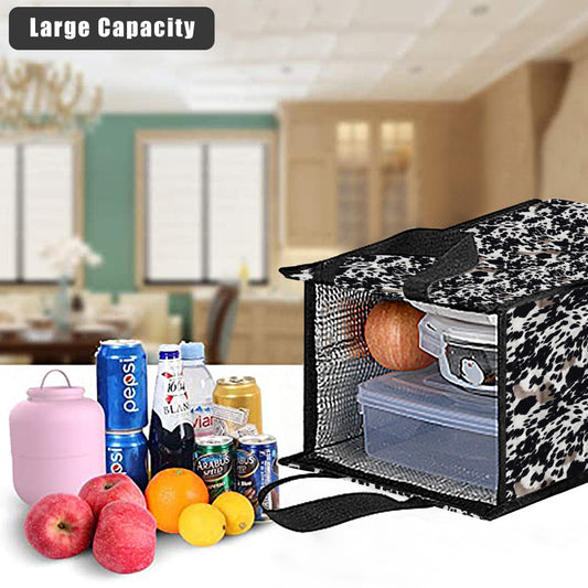 Cow Print Insulated Lunch Box Bag Tote, Black White Animal Ladies Food Container Adult Kids Female Women Teens Men School Work Handbag