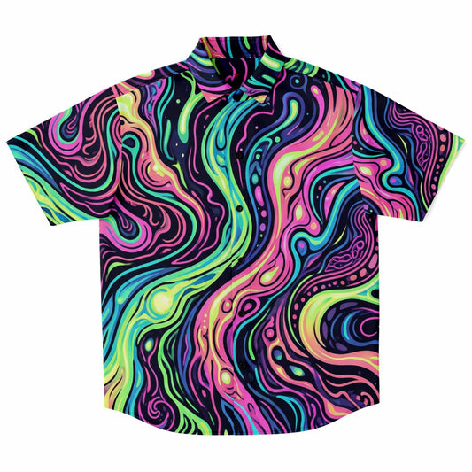 Psychedelic Men Button Up Shirt, Vibrant Trippy Funky Festival Short Sleeve Print Casual Buttoned Down Summer Male Guys Collared Designer