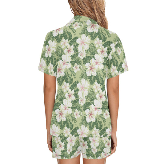 Green Floral Pajamas Set, White Flowers Botanical Sleepwear Short Sleeve Sleep Shirt Shorts Night Plus Size Summer Designer PJs Button Up