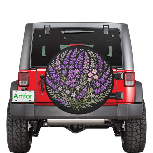 Purple Flowers Spare Tire Cover, Lavender Lilac Floral Faux Embroidery Print Floral Wheel Auto Car Backup Camera Hole Trailer Back Women RV