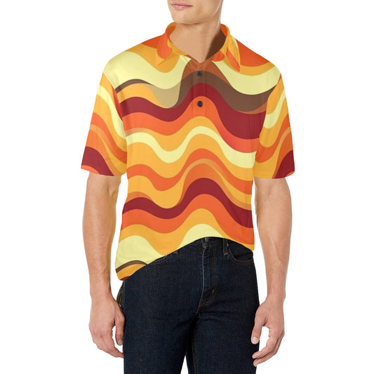 70s Retro Men Polo Collared Shirt, Orange Groovy Wavy Vintage Pattern Casual Summer Buttoned Down Up Shirt Short Sleeve Sports Golf Tee