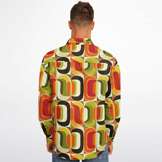 Mid Century Long Sleeve Men Button Up Shirt, Colorful Orange Red Retro Vintage 70s Guys Male Buttoned Down Collared Casual Dress Plus Size
