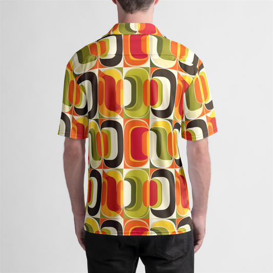 70s Retro Mid Century Men Button Up Shirt, Camp Short Sleeve Print Casual Moisture Wicking Buttoned Down Summer Guys Collared Designer Dress