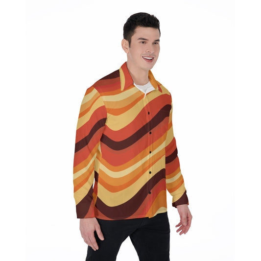 Retro Brown Wavy Long Sleeve Men Button Up Shirt, 70s Vintage Seventies Brown Orange Print Buttoned Down Guys Male Collar Casual Dress