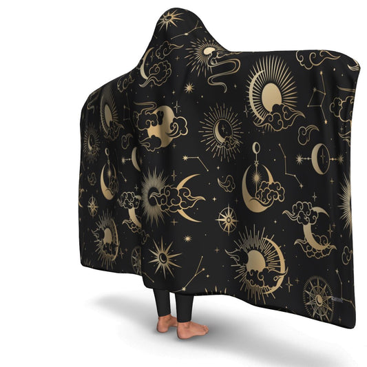 Moon Sun Sherpa Hooded Blanket, Stars Constellation Celestial Festival Fleece Microfleece Adult Youth Men Woman Wearable Cloak Winter Gift