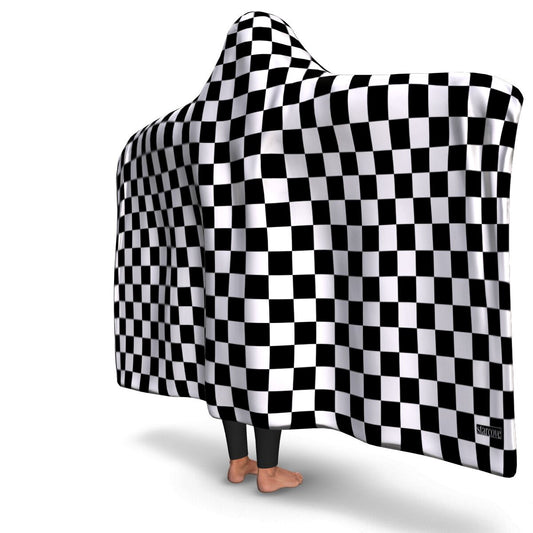 Black White Checkered Hooded Blanket, Check Racing Flag Fleece Microfiber Fluffy Sherpa Adult Youth Men Woman Wearable Cloak Winter Gift