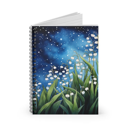 Lily of the Valley Flowers Spiral Notebook, Night Sky Watercolor Traveler Design Small Journal Notepad Ruled Line Book Paper Pad Aesthetic