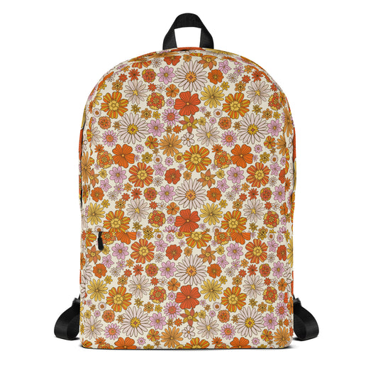 Floral Backpack, Retro Flowers Daisy Pink Orange 15" Laptop Men Women Kids Her School College Waterproof Pockets Canvas Bag