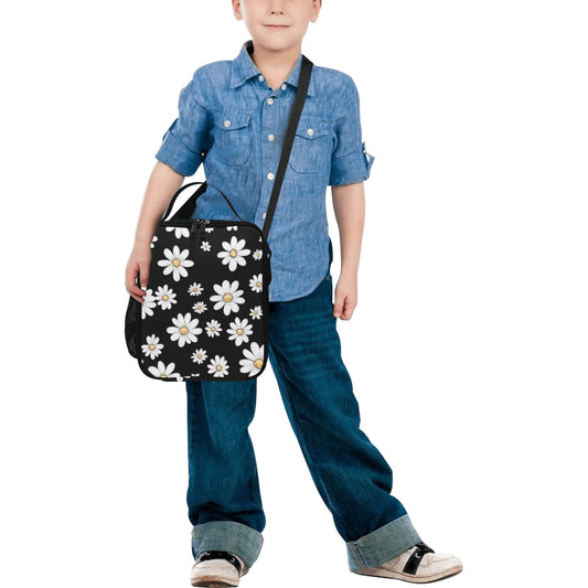Daisy Insulated Kids Lunch Tote Box Bag, Floral Flowers White Black Cute Food Container Children Teens Black School Work Handbag Boys Girls