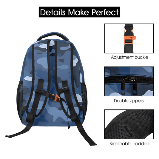 Navy Blue Camo Backpack, Camouflage Men Women Kids Gift School College Cool Waterproof Side Pockets Laptop Designer Aesthetic Bag
