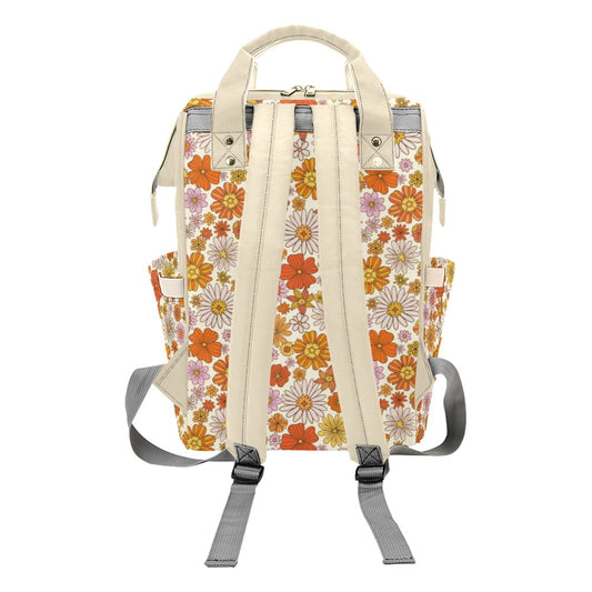 Retro Floral Diaper Bag Backpack, Pink Flowers Groovy 70s Baby Girl Waterproof Insulated Pockets Stylish Mom Designer Men Women Multipurpose