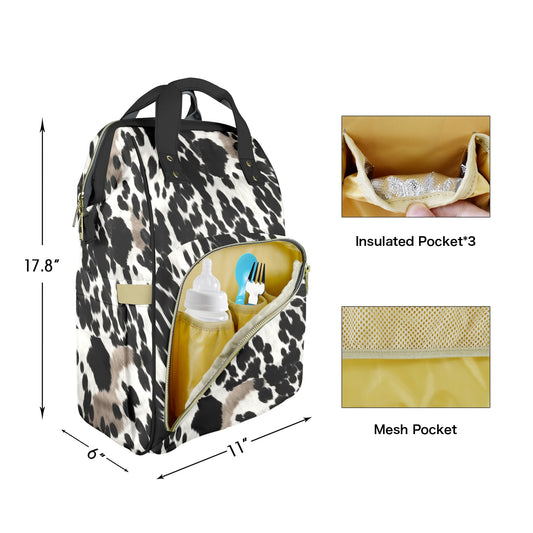 Cow Print Diaper Bag Backpack, Black White Brown Animal Nappy Baby Boy Girl Waterproof Insulated Pockets Stylish Mom Dad Designer Men Women