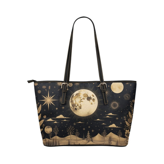 Moon Stars Sun Tote Bag Purse, Night Sky Boho Print Handbag Vegan Leather Zip on Top Designer Handmade Shoulder Small Large Bag Women Ladies