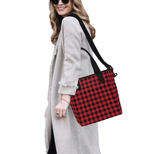 Red Buffalo Plaid Canvas Tote Bag with Shoulder Strap, Check Print Black Beach Summer Aesthetic Shopping Reusable Bag with Pockets