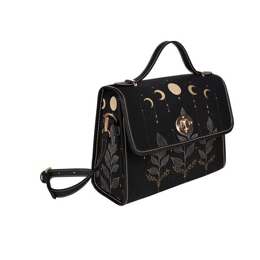 Moon Phases Canvas Satchel Bag, Celestial Cottagecore Ferns Witchy Waterproof Black Cute Women Crossbody Purse Vegan Leather Strap Handbag