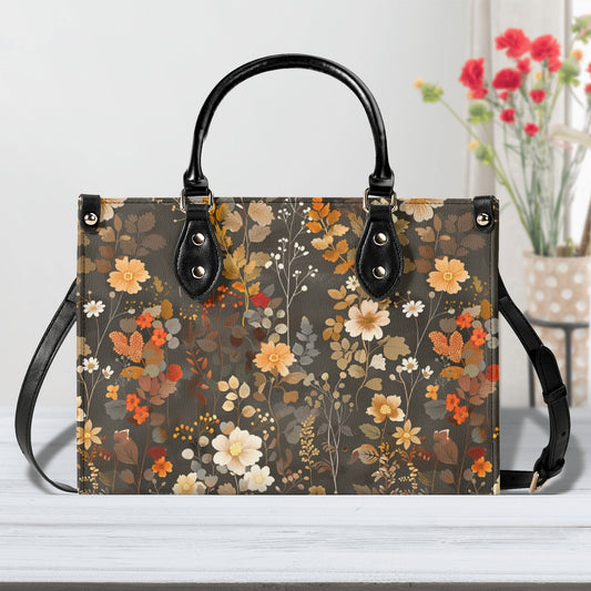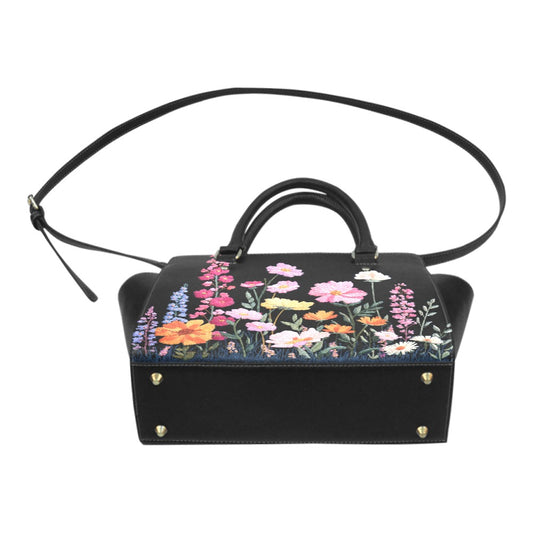 Floral Purse Handbag, Pink Purple Flowers Faux Embroidery Vegan Leather Designer Women Ladies Female Tote Top Zip Handle Bag Shoulder Strap