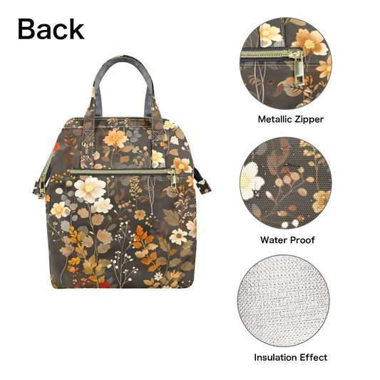 Floral Insulated Lunch Box Bag Tote, Brown Green Flowers Cute Food Container Adult Kids Women Teens Men School Work Handbag