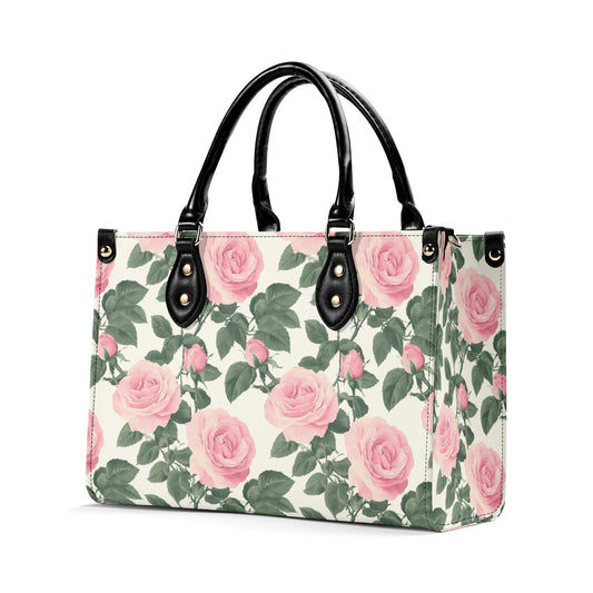 Floral Purse Handbag, Pink Green Flowers Faux Embroidery Vegan Leather Designer Women Ladies Female Tote Top Zip Handle Bag Shoulder Strap