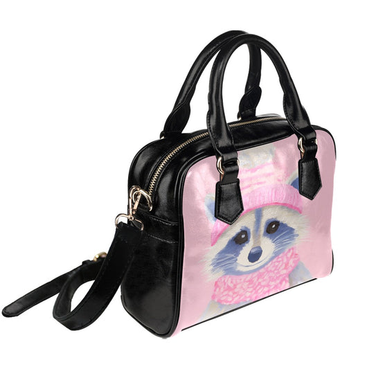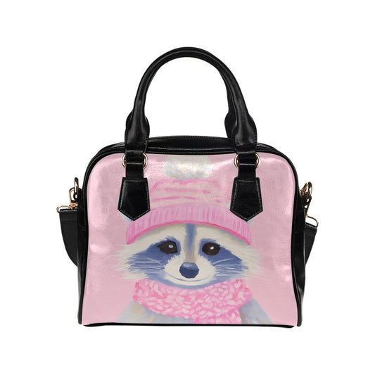 Pink Raccoon Purse, Cute Animal Print Small Shoulder Black Vegan Leather Women Ladies Designer Zipper Strap Handbag Crossbody Bag