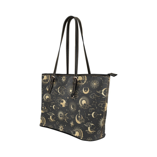 Moon Stars Sun Tote Bag Purse, Galaxy Space Print Handbag High Grade Leather Zip on Top Designer Handmade Shoulder Bag For Women