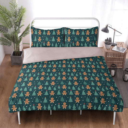 Gingerbread Man Bedding 3pc Set, Christmas Xmas Green Trees One Duvet Cover and Two Pillow Covers King Queen Full Twin Size Bed Bedroom