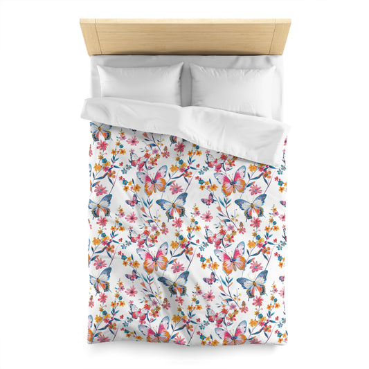 Butterfly Duvet Cover, Floral Flowers Pink White Bedding Queen King Full Twin XL Microfiber Unique Designer Bed Quilt Bedroom Decor