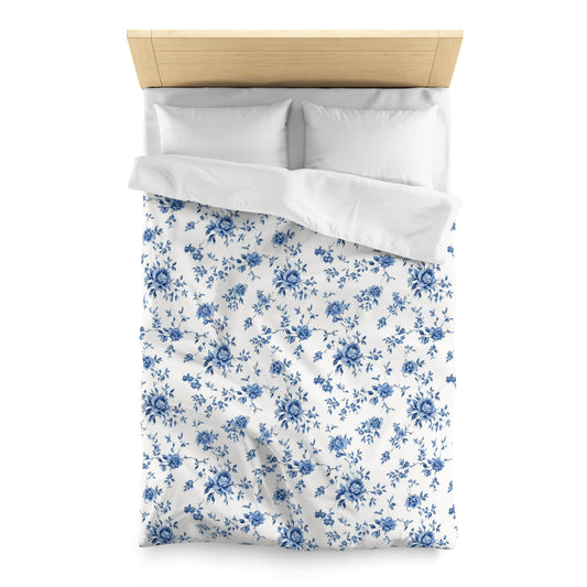 Blue Floral Duvet Cover, White Vintage Flowers Bedding Queen King Full Twin XL Microfiber Unique Designer Bed Quilt Bedroom Decor