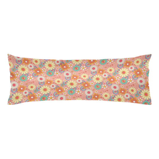 Pink Floral Body Pillow Case, Pink Boho Retro 70s Groovy Flowers Long Large Bed Accent Print Throw Decor Satin Decorative Cover 20x54
