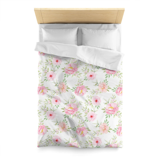 Pink Floral Duvet Cover, White Vintage Flowers Bedding Queen King Full Twin XL Microfiber Unique Designer Bed Quilt Bedroom Decor