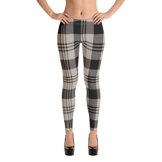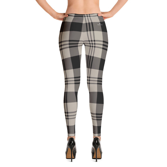 Plaid Leggings, Grey Cream Buffalo Yoga Pants, Tartan Clothing Pants, Checkered Printed Workout Leggings for Women