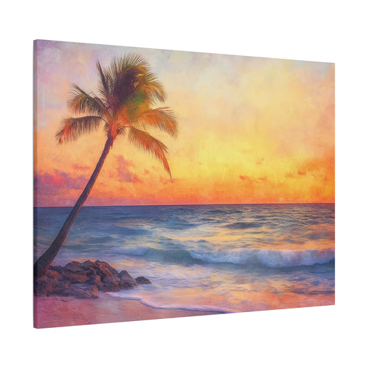 Sunset Beach Canvas Gallery Wrap, Palm Tree Ocean Waves Wall Art Print Artwork Decor Small Large Hanging Modern Vintage Landscape Poster