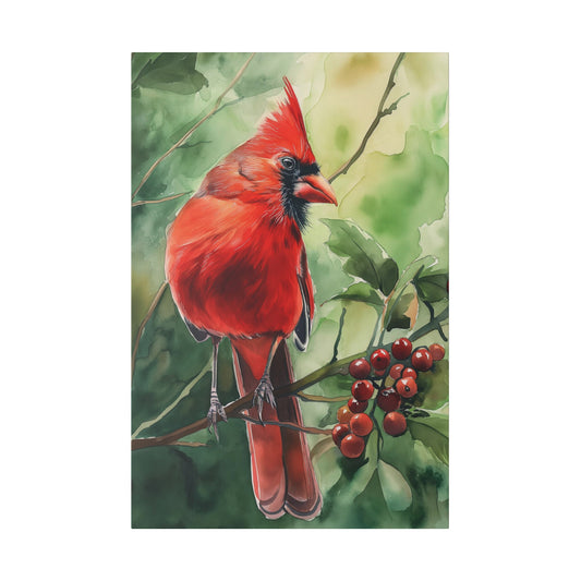 Red Carinal Bird Canvas Gallery Wrap, Watercolor Berries Wall Art Print Decor Small Large Hanging Modern Vertical Living Room