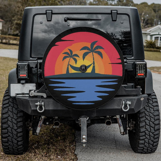 Beach Spare Tire Cover, Sunset Backup Camera Hole Rear Wheel Accessories Sun Tropical Palm Trees Custom Unique Design Trailer Camper RV Back