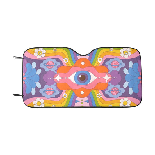 Psychedelic Windshield Sun Shade, Hippie Eye Flowers 70s Art Car Solar Reflector Auto Protector Window Visor Screen Cover Vehicle Windscreen