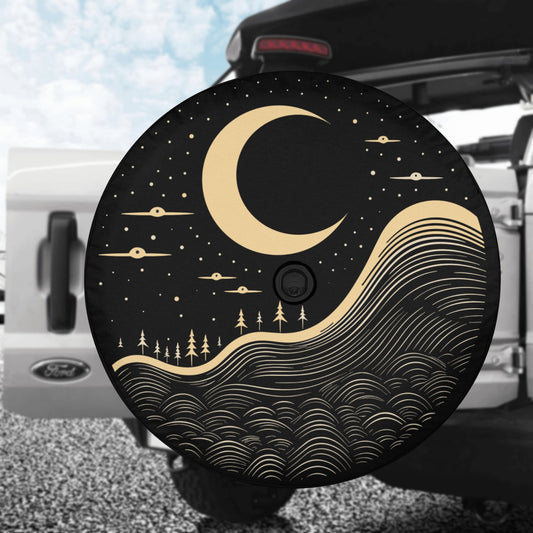 Moon Spare Tire Cover, Crescent Trees Wheel Mountains Line Drawing Unique Car Accessory Back Up Camera Hole Men Women Girls Camper Rear RV