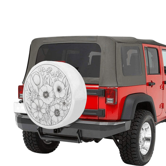 Flowers Spare Tire Cover, Floral Drawing White Wheel Accessories Custom Unique Design Backup Camera Hole Trailer Back Women Gift