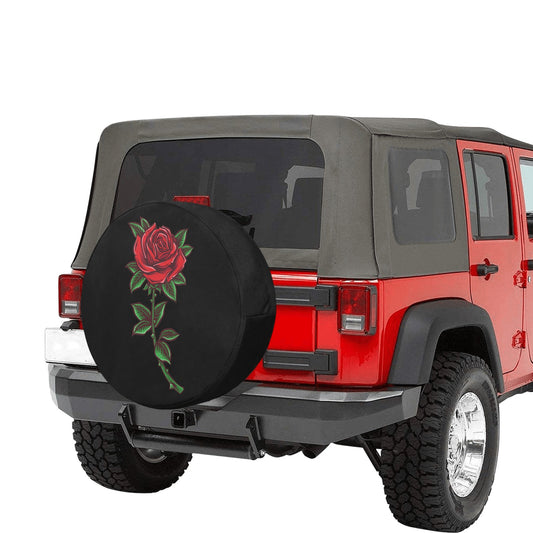 Rose Flowers Spare Tire Cover, Red Floral Tattoo Black Wheel Auto Back Up Camera Hole Unique Design Women Back RV Trailer Feminine