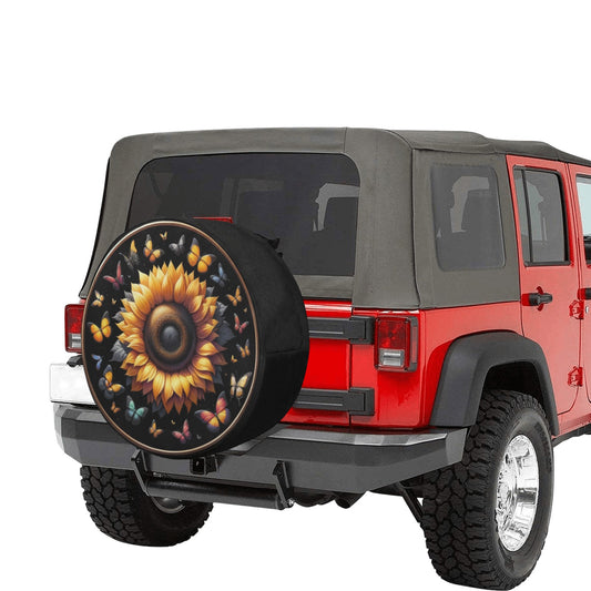 Sunflower Butterfly Tire Cover, Spare Wheel Floral Yellow Flowers Black Custom Back Camera Hole Unique Design Car Women Girls RV Camper