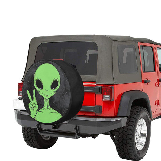 Alien Peace Sign Spare Tire Cover, Space Green Backup Camera Hole Rear Wheel Accessories Custom Unique Design Trailer Camper RV Back