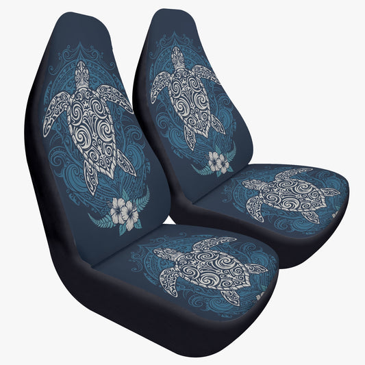 Hawaiian Sea Turtle Car Seat Covers 2 pc, Blue Boho Tribal Pattern Polynesian Art Front Auto SUV Protector Decor Automotive Universal Women