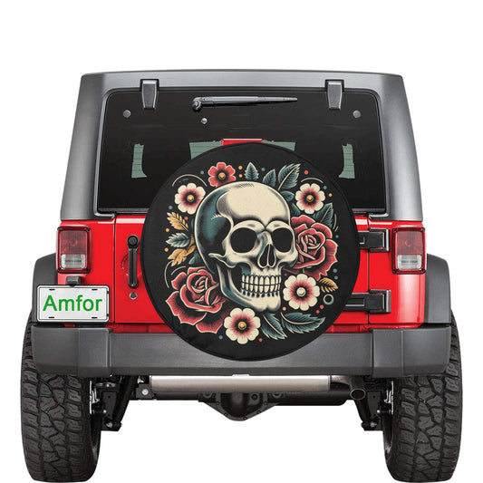 Skull Floral Spare Tire Cover, Car Roses Skeleton Old School Tattoo Backup Camera Hole Rear Wheel Trailer Camper RV Back Men Women Protector
