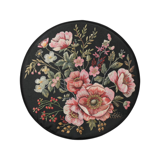 Pink Flowers Spare Tire Cover, Faux Embroidery Printed Floral Rear Wheel Accessories Unique Camper Backup Camera Hole Trailer Back Women RV
