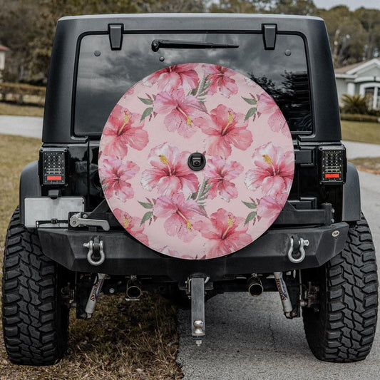 Pink Hibiscus Flowers Spare Tire Cover, Hawaiian Floral Backup Camera Hole Unique Back Extra Wheel Cars RV Men Women Girls Trailer Campers
