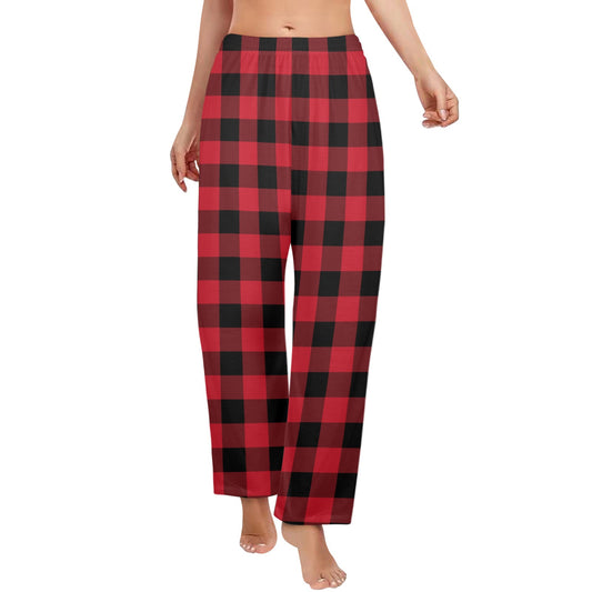 Red Buffalo Plaid Women Pajamas Pants, Black Check Tartan Christmas Xmas Satin PJ Pockets Trousers Couples Matching Ladies Trousers Bottoms