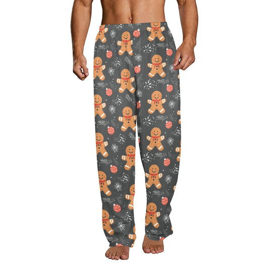 Gingerbread Christmas Men Pajamas Pants, Xmas Holidays Snow Grey PJ Pockets Sleep Lounge Trousers Guys Male Matching Sleepwear Bottoms