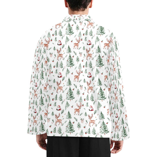 White Christmas Trees Men Sleep Pajama Long Sleeve Shirt, Reindeer Santa Claus Xmas Button Down Guys Sleeping Cute Pjs Night Loungewear