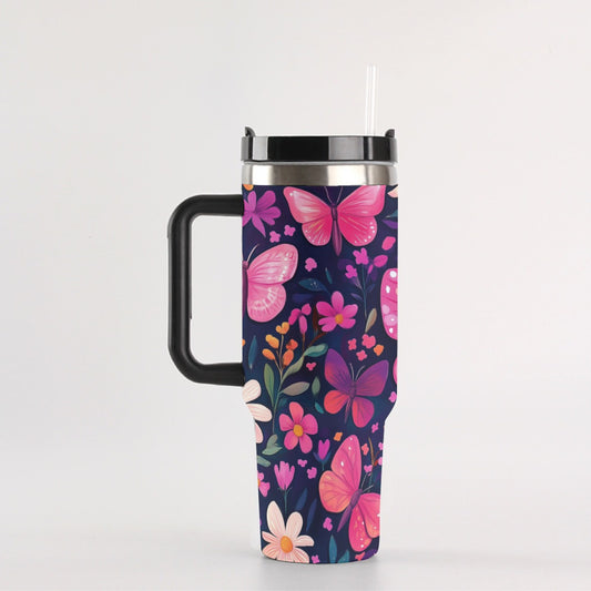 Pink Butterflies Floral 40 oz Tumbler with Handle Straw, Flowers Stainless Steel Cup Travel Mug Coffee Insulated Eco Friendly Office